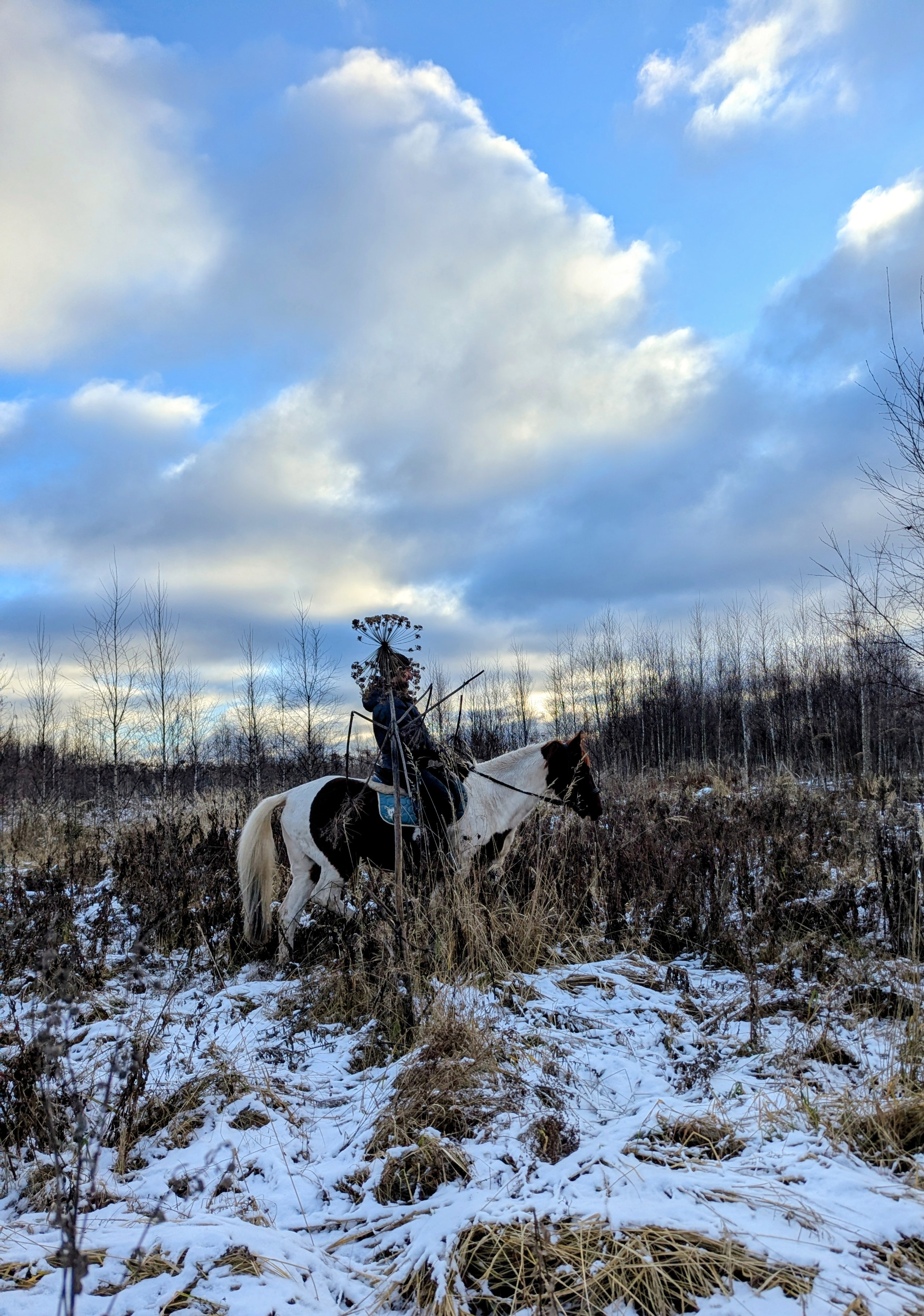 Кони пробуют копытами мягкую поверхность, избегая наступать на лед или комья земли под белым покрывалом. Мы отдаем повод коням - делайте что хотите... Зима!